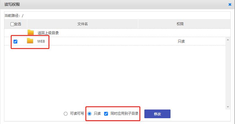 找到【讀寫權限】并打開,將網站根目錄設置為只讀,然后將Data和Upload目錄設置為可讀寫