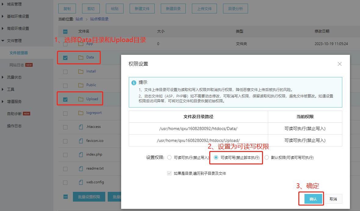 第2步:設(shè)置Data目錄和Upload目錄為可讀寫權(quán)限