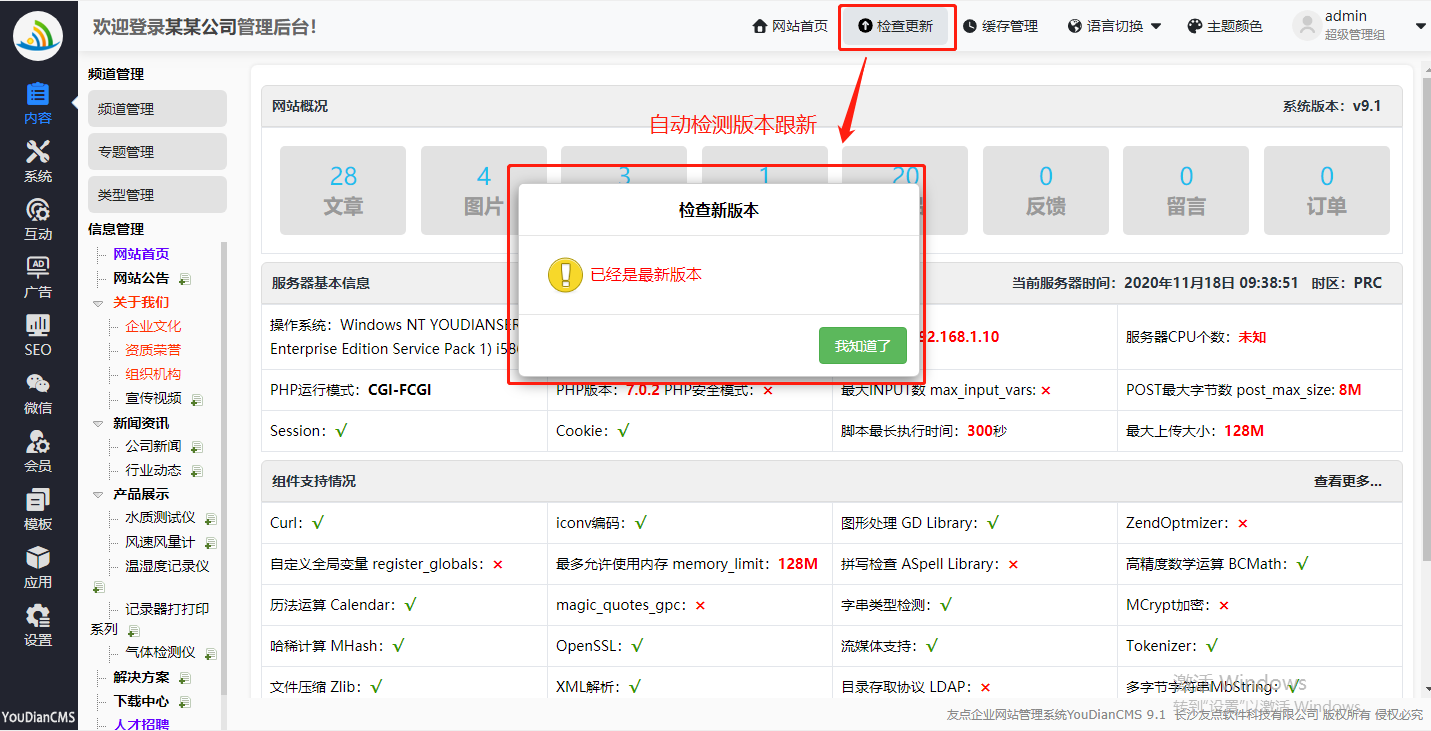 - 登錄后臺界面就可以看到頂部的【檢查更新】按鈕,可以檢查系統(tǒng)版本和在線升級,如下圖右上角: