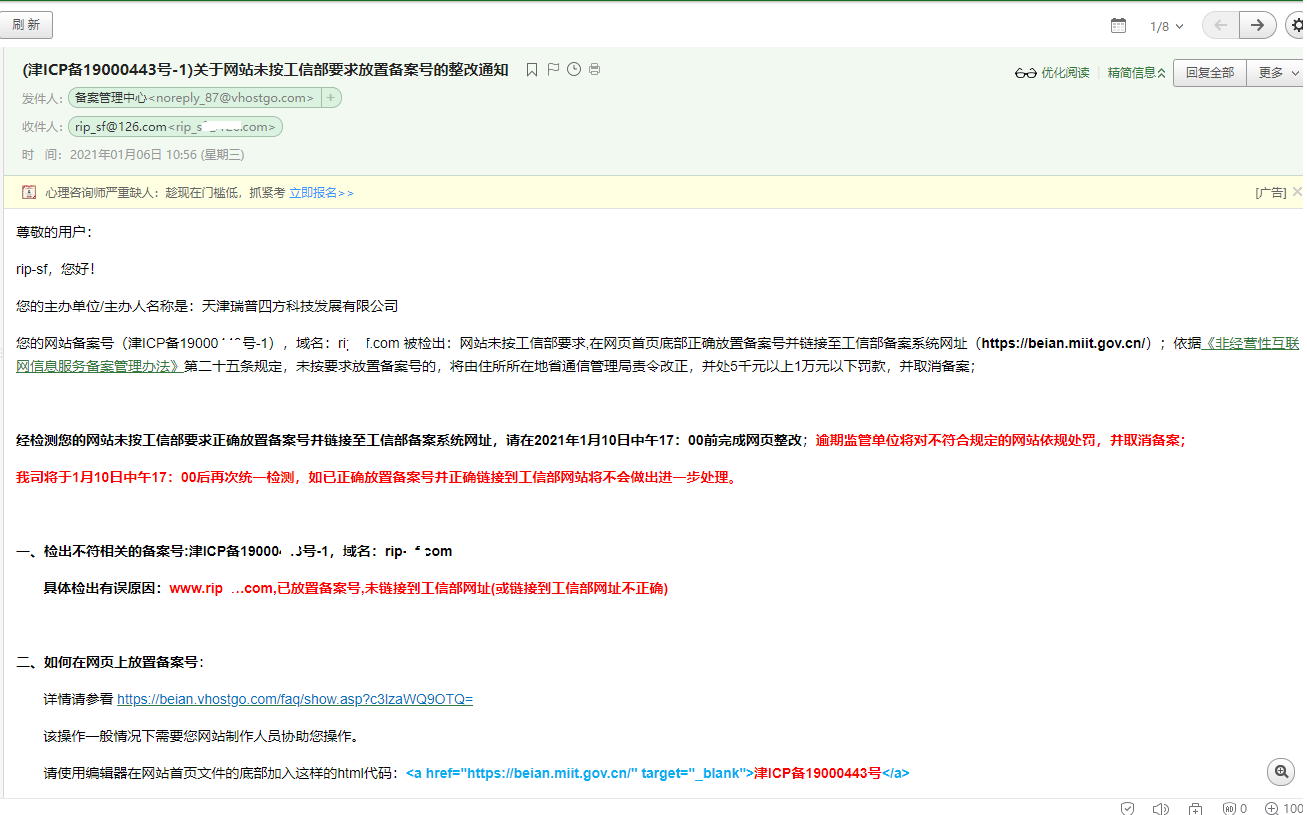 最近很多用戶收到工信部發(fā)來“關(guān)于網(wǎng)站未按工信部要求放置備案號(hào)的整改通知”,郵件大致如下: