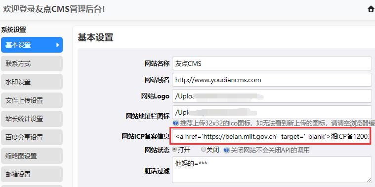 1、登錄網(wǎng)站后臺(tái),在系統(tǒng)設(shè)置——》基本設(shè)置里——》找到“網(wǎng)站ICP備案信息”,如下圖