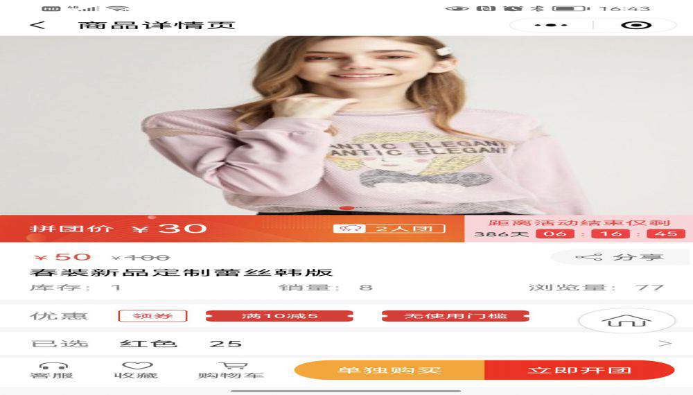 拼團:基于微信社交的拼團,開團后邀請好友成團。