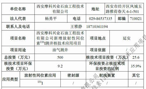 西安摩科興業石油工程技術有限公司新增放射性同位素131I測井核技術應用項目