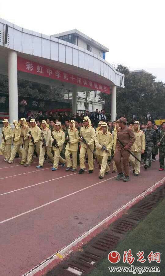 10月30日上午,咸陽彩虹學校就此事回復了《陽光報》記者;貜头Q:10月29日下午彩虹中學舉行第十屆體育健康節開幕式。開幕式上有各年級運動員方隊、表演方隊出場的場景。高一年級的研究性學習小組結合當前形勢,將愛國主義集中展現,主題是:“勿忘國恥,振興中華”。學生們自編自演通過短劇表演和場外解說,展示了抗戰時期的英雄人物“狼牙山五壯士”、“李云龍”等與日寇浴血奮戰的故事,按節目需要租賃了一些服裝道具。事后網上轉載了學生們身著日本軍服出場的照片,引發了網民的關注。