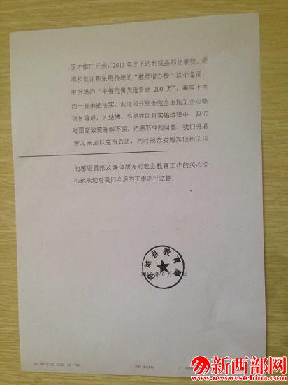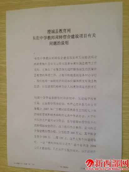 隨后記者又來到澄城縣教育局,在局紀檢委書記的指引下,記者見到了該局勤工辦王老師。王老師告訴記者,局里具體負責學校工程建設的同志下鄉去了,他前些年曾參與過有些學校的建設工作,并介紹說,韋莊中學早些年校舍一直比較陳舊,2007年曾申報過改造項目,但當時國家沒有危房改造項目這種說法,所以未能申報成功,但校方自籌資金解決了教師宿辦樓。自2008年汶川大地震后,國家加大了對農村校舍危房改造力度,學校這才成功以教師周轉房的名義向縣財政申請到了272萬元財政支持,這些錢用于支付了前面的教師宿辦樓工程款,但后面的教師周轉房卻由于資金問題沒有動工,具體到賬及支付情況他不清楚,局里財務具體經辦。