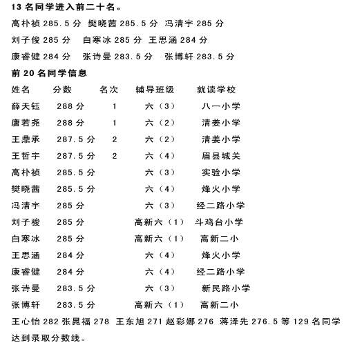 另有馬逍悅、王梓玥等20名同學以優異成績接近錄取分數線,進入西工大附中《希望之星》名單。