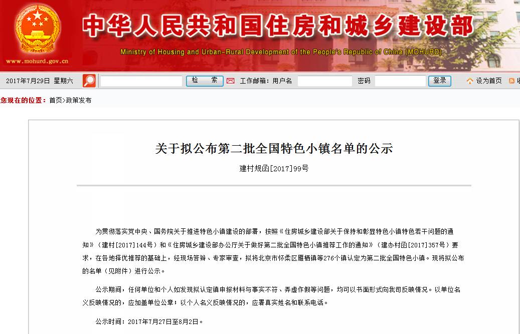 《關于擬公布第二批全國特色小鎮名單的公示》
