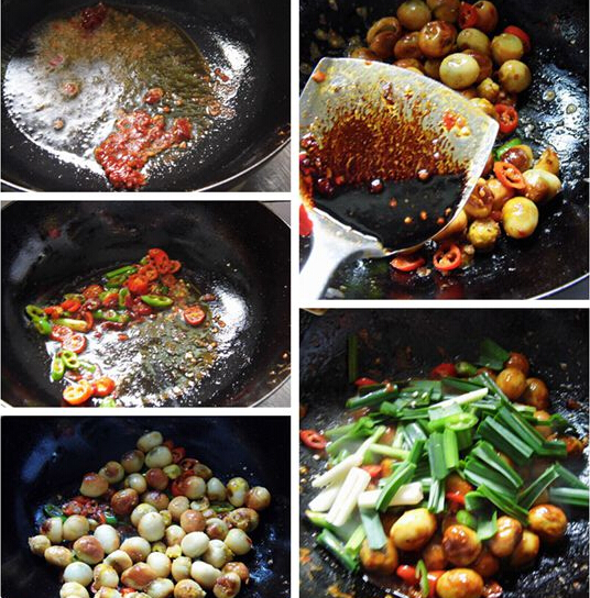 鵪鶉蛋500克,蒜苗2根,青尖椒1個,紅尖椒2個。