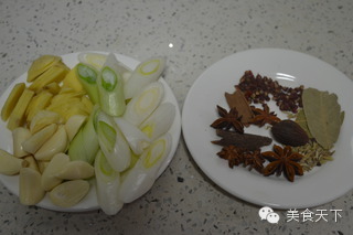 3、蔥切段,姜蒜切片、備八角、花椒、草果、小茴香、桂皮、香葉。