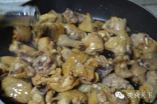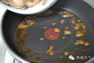 9、凈鍋燒熱,入油燒至7成熱,下入白糖炒制糖色,待糖起色,關小火,快速倒入雞塊。
