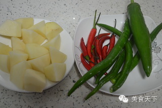 2、土豆洗凈切滾刀塊,備紅朝天椒、線椒、青椒。