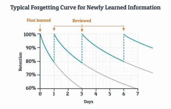 當我們在每一個重要的時間節點都能夠做到反復的時候,我們則會擁有一條改造后的遺忘曲線:我們可以記住的東西越來越多,直至接近100%。