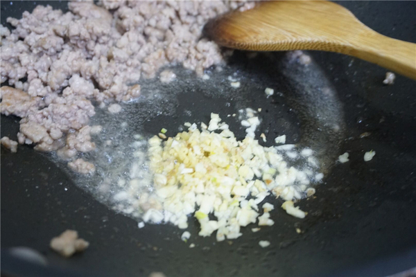 3、坐熱炒鍋,放入1勺食用油,用快火把肉沫迅速炒散至變色。
