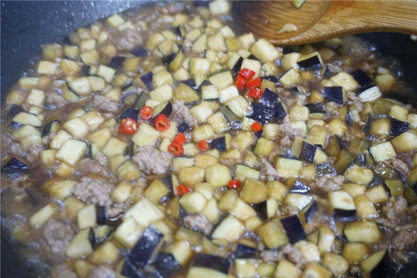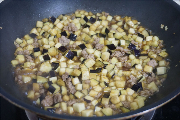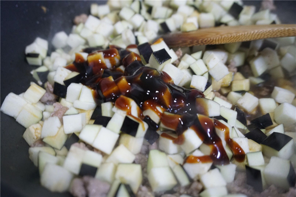 5、這里和大家分享個小竅門,用2勺生抽 1大勺的蠔油炒茄丁,口感鮮美,色澤還好看。