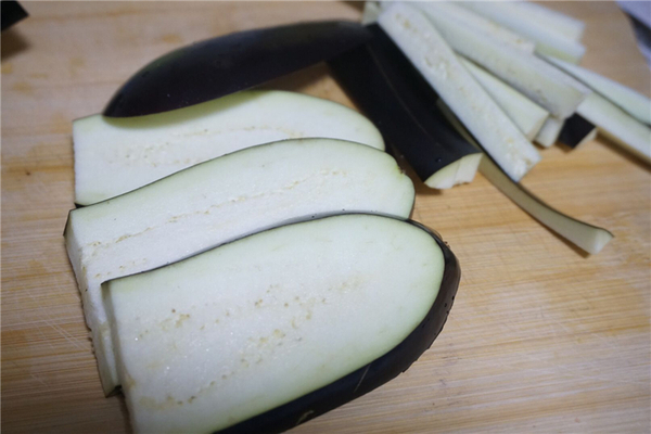 1、長茄子洗凈切小丁,用水侵泡10分鐘。