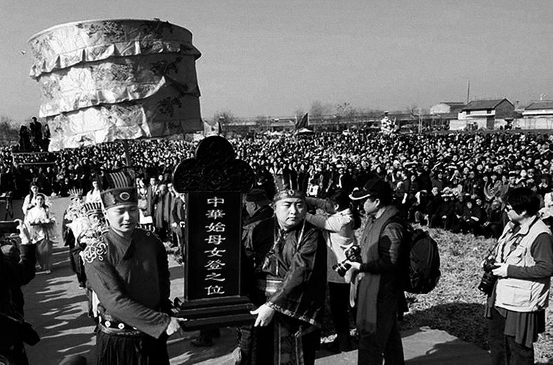 “每年農(nóng)歷正月二十五至二十六,鳳翔槐原村以及周邊地區(qū)的村民,甚至甘肅、河南、山西等省的百姓,不辭辛勞,結(jié)伴搭伙,頂風(fēng)踏塵來到槐原‘女登祠’祭拜炎帝及其母——女登。”3月13日,戊戌年正月二十六,在首屆女登文化藝術(shù)節(jié)上,來自寶雞的攝影愛好者屈曉軍加入數(shù)萬人的“人海”,共同祭奠中華始母女登。