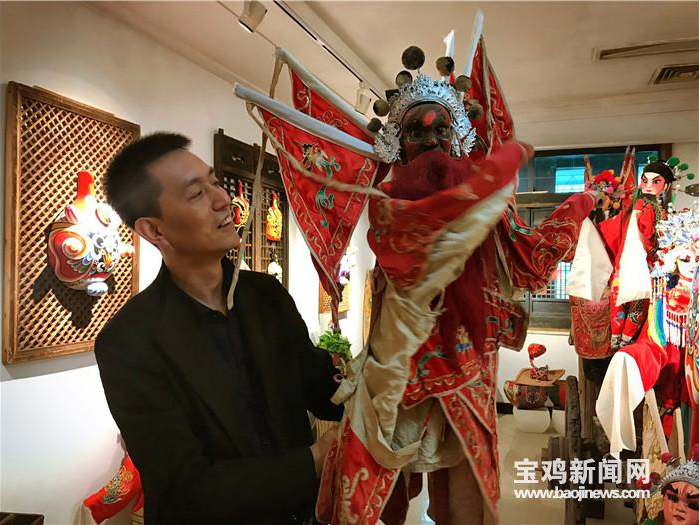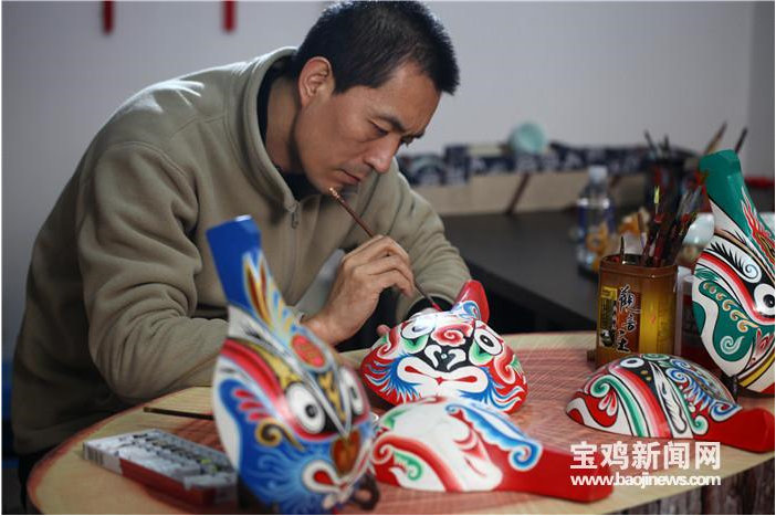 社火臉譜藝術是寶雞非物質文化遺產具有代表性的藝術形式之一,歷史久遠、造型奇特、色彩鮮明。陜西省工藝美術大師、寶雞社火臉譜技藝傳承人薛亞兵,則用獨特的臉譜和木偶展示了寶雞社火歷史的變遷。薛亞兵時常從老藝人那收集社火臉譜及木偶。