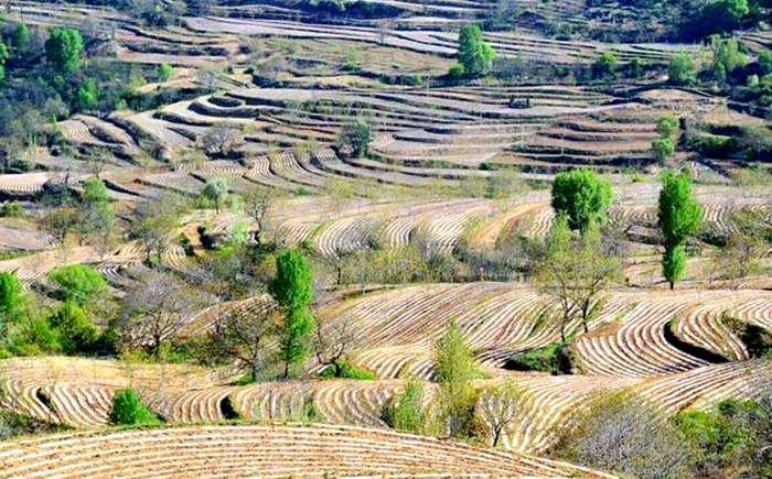 梯田的美,美在線條,而簡單的線條卻包含了:節奏、韻律、對稱、均衡、連續、間隔、重疊、單獨、粗細、疏密、反復、交叉、錯綜、一致、變化、統一等種種形式規律。雖然沒有南方梯田的水光瀲滟,但一樣層層疊疊,如鏈似帶,從山腳一直盤旋到山頂,蔚為壯觀。它們有力詮釋了“勞動創造美”“美是合規律性與合目的性的統一”“美是有意味的形式”等等這樣一些美學上的經典論斷。
