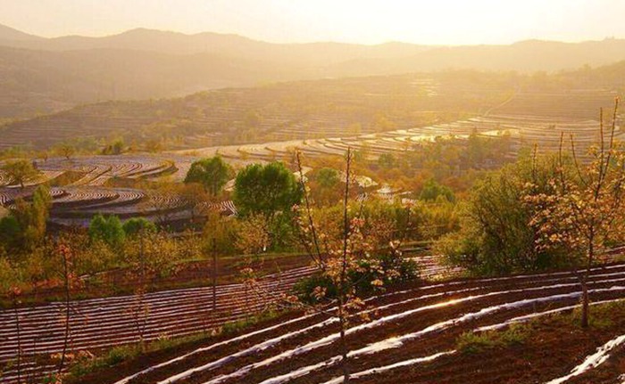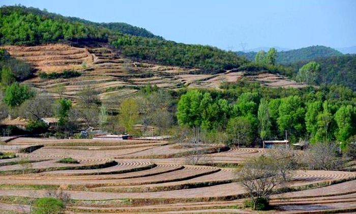 銀絲帶,黃土地,錯把旱田當水梯。夕陽美,翠色飾,山嶺寂靜染金漆。
