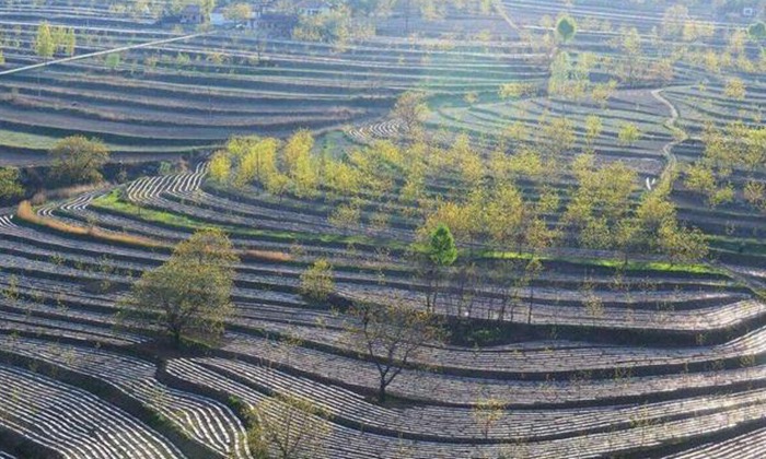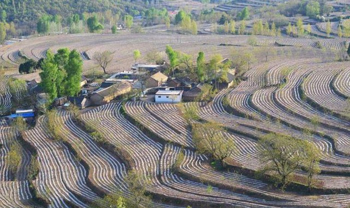 早春四月,山城宜君草長鶯飛、花紅柳綠。有個世外桃源般的地方盛滿了跳躍的春色,那就是素有“上帝指紋”美譽的哭泉旱作梯田。
